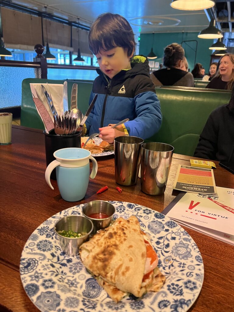 As a way to fend off my exhausted mood, we decided to just head out and went to Trafalgar Square (mostly because I knew it’d be deserted at 8am on a Saturday and wanted to show my son where I used to live, which was near there). Then, we went for the best breakfast in London — Dishoom! Their egg naan role is SO GOOD. I don’t know the last time I’ve had food this good in Amsterdam. It just makes me so happy. I actually went back two mornings later lol.